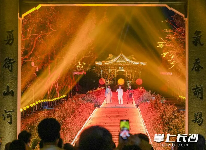 崇烈门前的“文武登高秀”,长沙历史上的知名文人、武将、青年代表次第登场,声光电的结合以及演员的真情演绎、肢体表达,让人感受到长沙这座英雄之城、革命之城的热血和厚度;