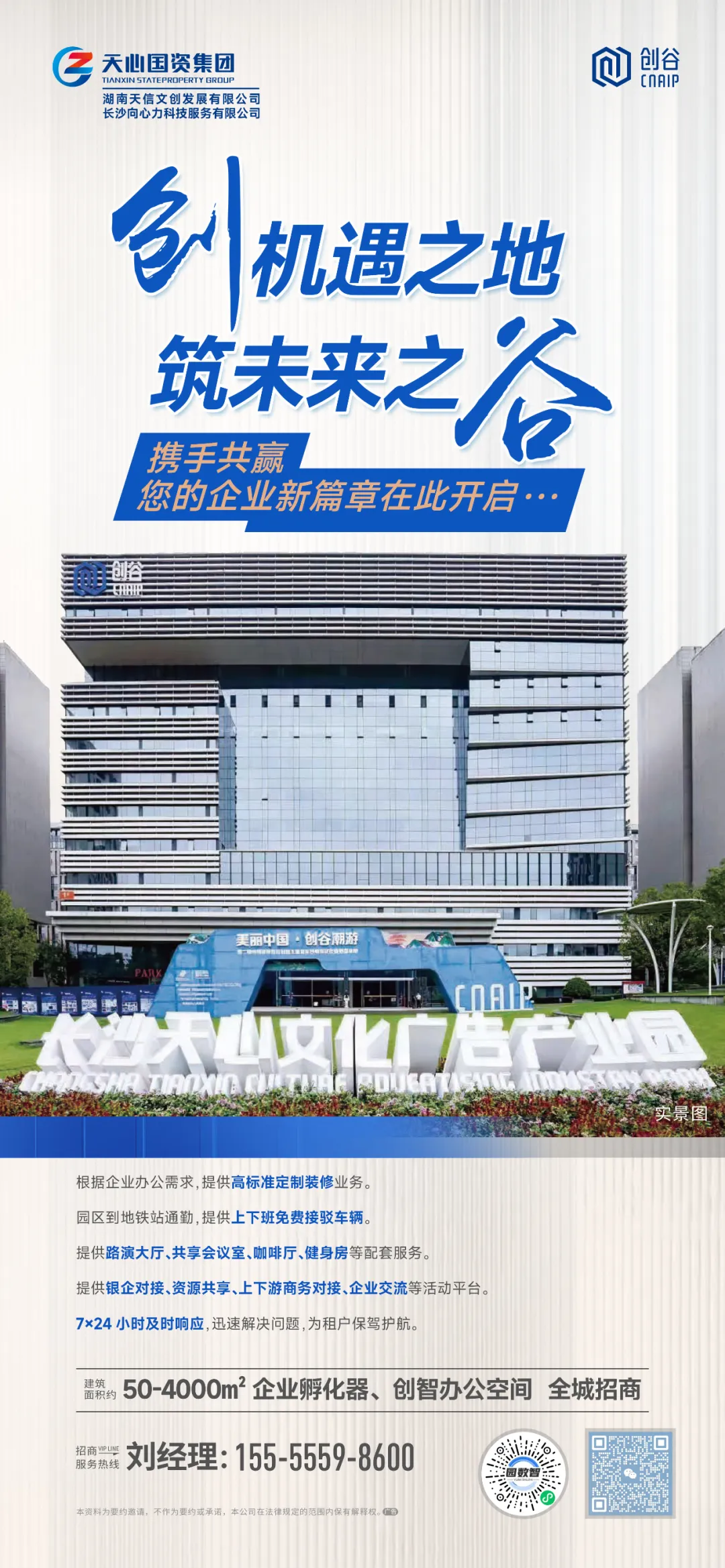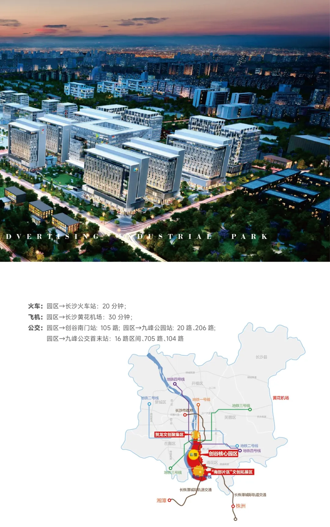 创谷·长沙天心文化(广告)产业园雄踞省府 CBD 核心坐拥三馆一中心、芙蓉南路商圈,位于国家级“长株潭城市群两型社会综合配套改革试验区”的核心地带,东接芙蓉路“南北贯通”;南依长沙绕城高速洞井路出入口“通达全城”;西牵湘府路大桥“两岸互联”;北连“湘江南路”直达城心。
