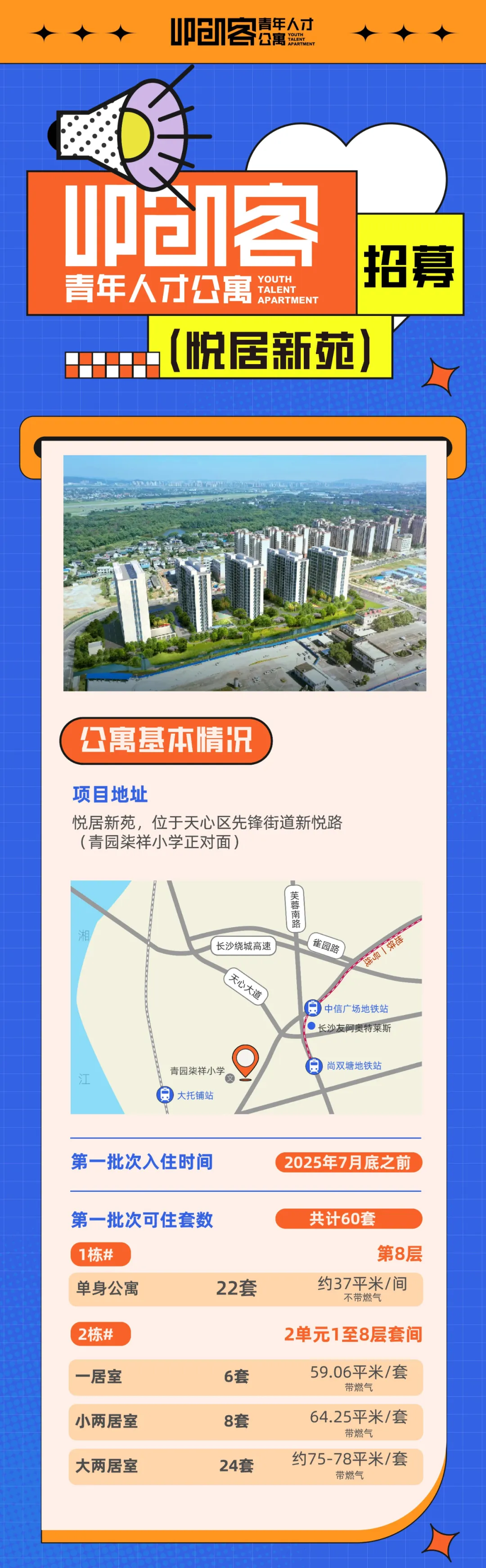 为推动天心区青年友好型城区建设,加强青年人才住房安居保障,营造良好的创新创业环境,现进行UP创客青年人才公寓(悦居新苑)项目首批住户的招募。项目地址位于天心区先锋街道新悦路(青园柒祥小学正对面)。